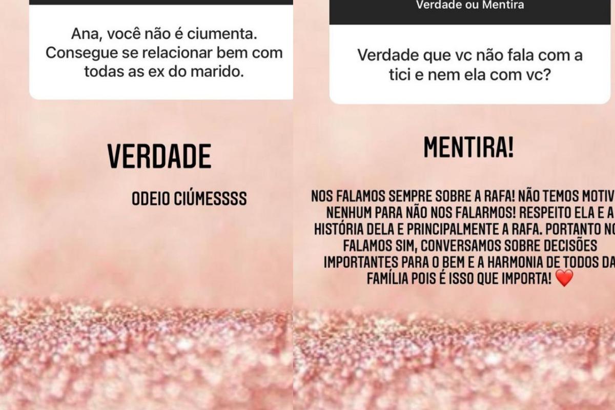 Ana falou que não sente ciúmes de nenhuma ex do marido. Além de esclarecer que tem uma ótima relação com Ticiane Pinheiro: “Mentira! Nos falamos sempre sobre a Rafa [Rafaella Justus, filha de Ticiane e Justus]! Não temos motivos nenhum pra não nos falarmos! Respeito ela e a história dela, e principalmente a Rafa. Portanto, nos falamos, sim, conversamos sobre decisões importantes para o bem e a harmonia de todos da família, pois é isso que importa!”.