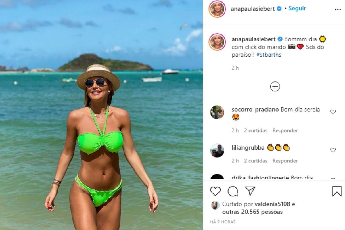 No clique, Ana Paula aparece sorridente de biquíni verde à beira-mar, com vista paradisíaca. “Bom dia com clique do marido. Saudades do paraíso!”, escreveu ela. O que chamou atenção dos internautas foi a ‘barriga chapada’ da modelo, que deu à luz Vicky há pouco mais de 5 meses. “Minha filha, você pariu mesmo? Que corpo”, disse uma seguidora. “Eu que lute”, ironizou outra. “Parou a internet”, brincou uma terceira.