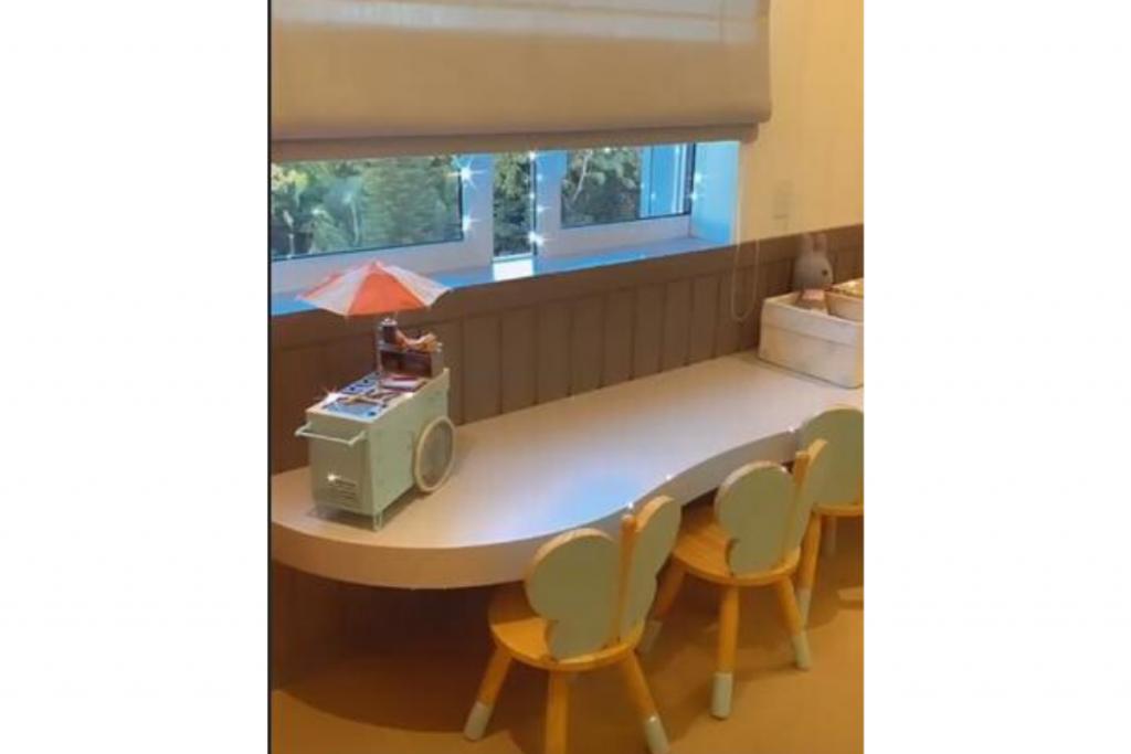 Com cadeiras em formato de borboleta, uma bancada grande e alguns brinquedos decorativos, Ana Paula mostrou como está ficando o cômodo para que Vicky possa brincar quando crescer mais um pouco.