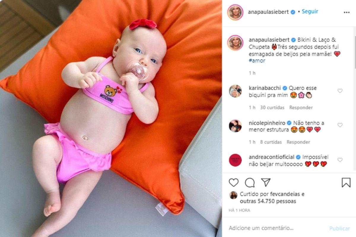 “Biquini & Laço & Chupeta. Três segundos depois fui esmagada de beijos pela mamãe”, escreveu Ana, na legenda. Vicky, que é fruto do relacionamento de Ana Paula com o empresário, Roberto Justus, fez muito sucesso nas redes sociais com sua roupa de banho. Diversos fãs e seguidores fizeram questão de elogiar. “Quero esse bíquini pra mim”, brincou Karina Bacchi. “Que coisa mais linda! Que Deus abençoe Ana”, escreveu a influenciadora digital, Bruna Cardoso.