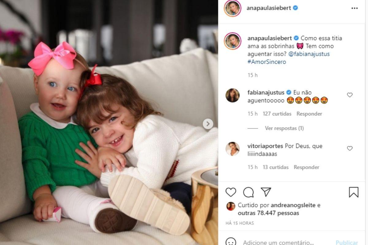 “Como essa titia ama as sobrinhas. em como aguentar isso?”, escreveu a modelo ao compartilhar a foto. Fabiana Justus também se encheu de amor ao ver as filhas ao lado de Vicky e fez questão de comentar. “Eu não aguentooooo”, escreveu.