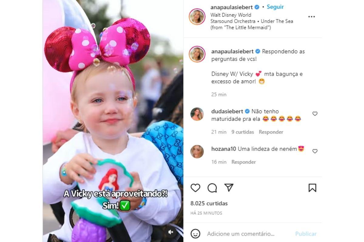 A modelo Ana Paula Siebert, costuma usar as redes sociais para compartilhar momentos especiais em família, principalmente ao lado da filha, Vicky. Nesta quarta-feira, 5 de dezembro, ela aproveitou para tirar dúvidas dos seguidores sobre a filha durante a viagem de férias no Walt Disney World Resort, em Orlando, EUA. Ela aproveitou a oportunidade para brincar sobre o assunto.