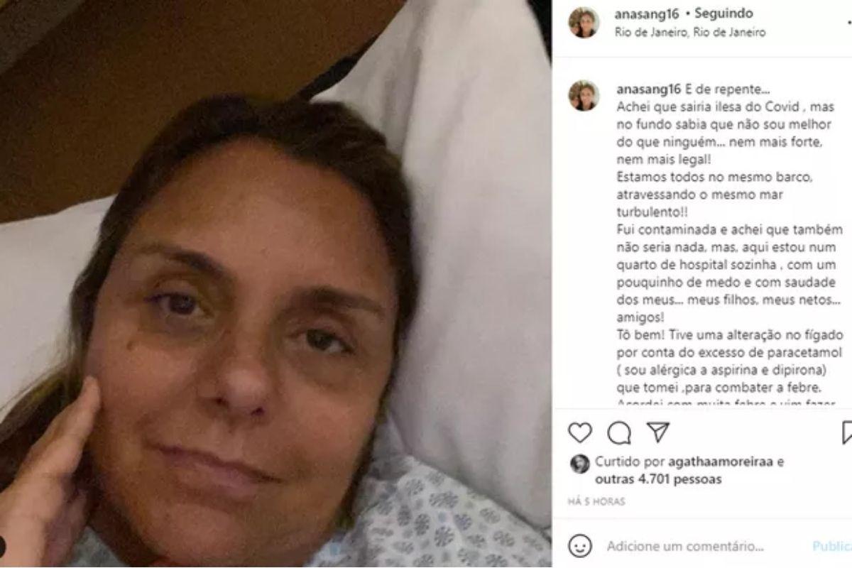 No post, Ana Sang fez um desabafo sobre a saudade da família. “E de repente… Achei que sairia ilesa do Covid, mas no fundo sabia que não sou melhor do que ninguém… nem mais forte, nem mais legal! Estamos todos no mesmo barco, atravessando o mesmo mar turbulento!! Fui contaminada e achei que também não seria nada, mas, aqui estou num quarto de hospital sozinha, com um pouquinho de medo e com saudade dos meus… meus filhos, meus netos… amigos!”, começou.