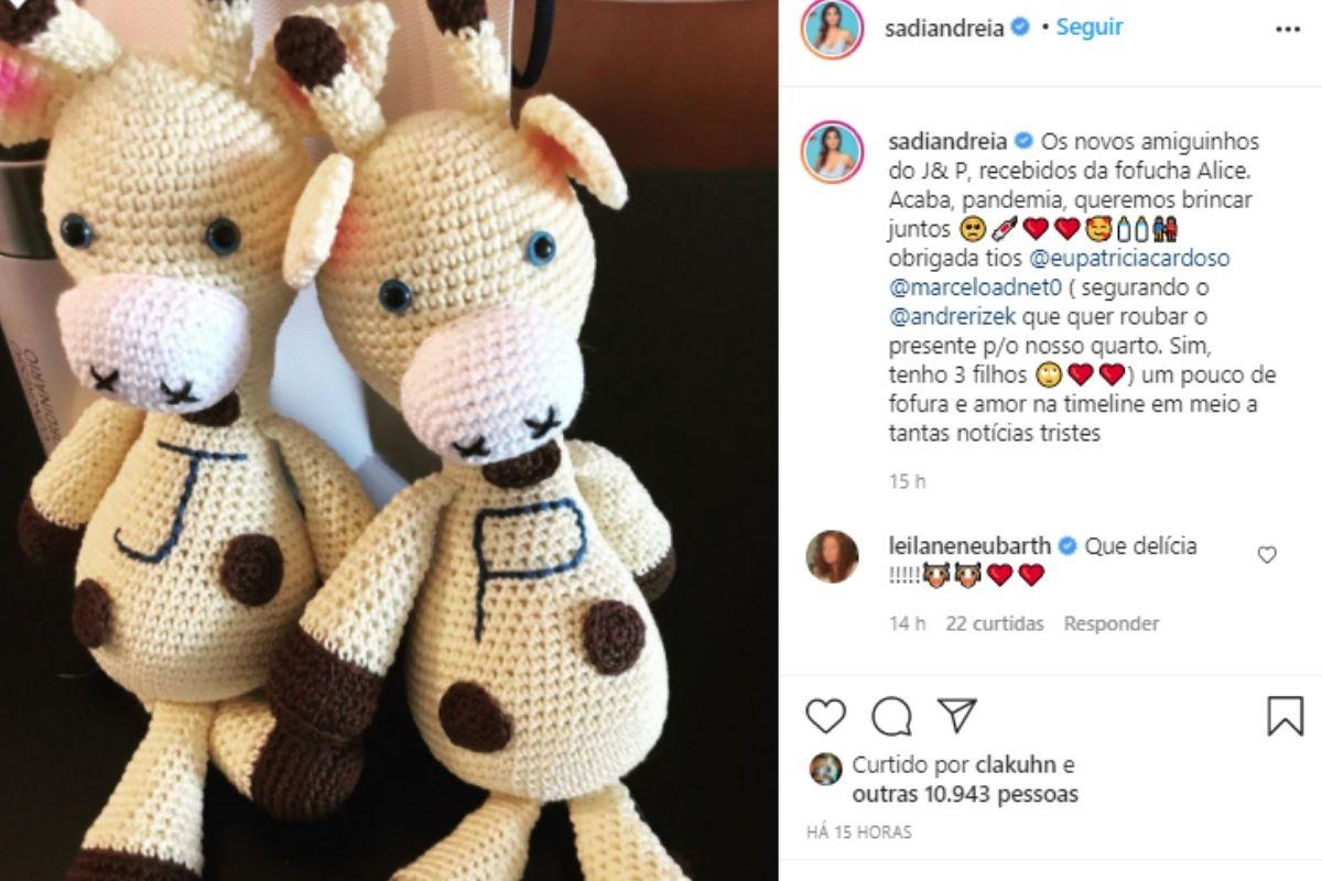 No post, Andreia mostra o presente de crochê que recebeu dos amigos. “Os novos amiguinhos do J&P, recebidos da fofucha Alice. Acaba, pandemia, queremos brincar juntos. Obrigada, tios @eupatriciacardoso @marceloadnet0. Um pouco de fofura e amor na timeline em meio a tantas notícias tristes”, escreveu ela na publicação.