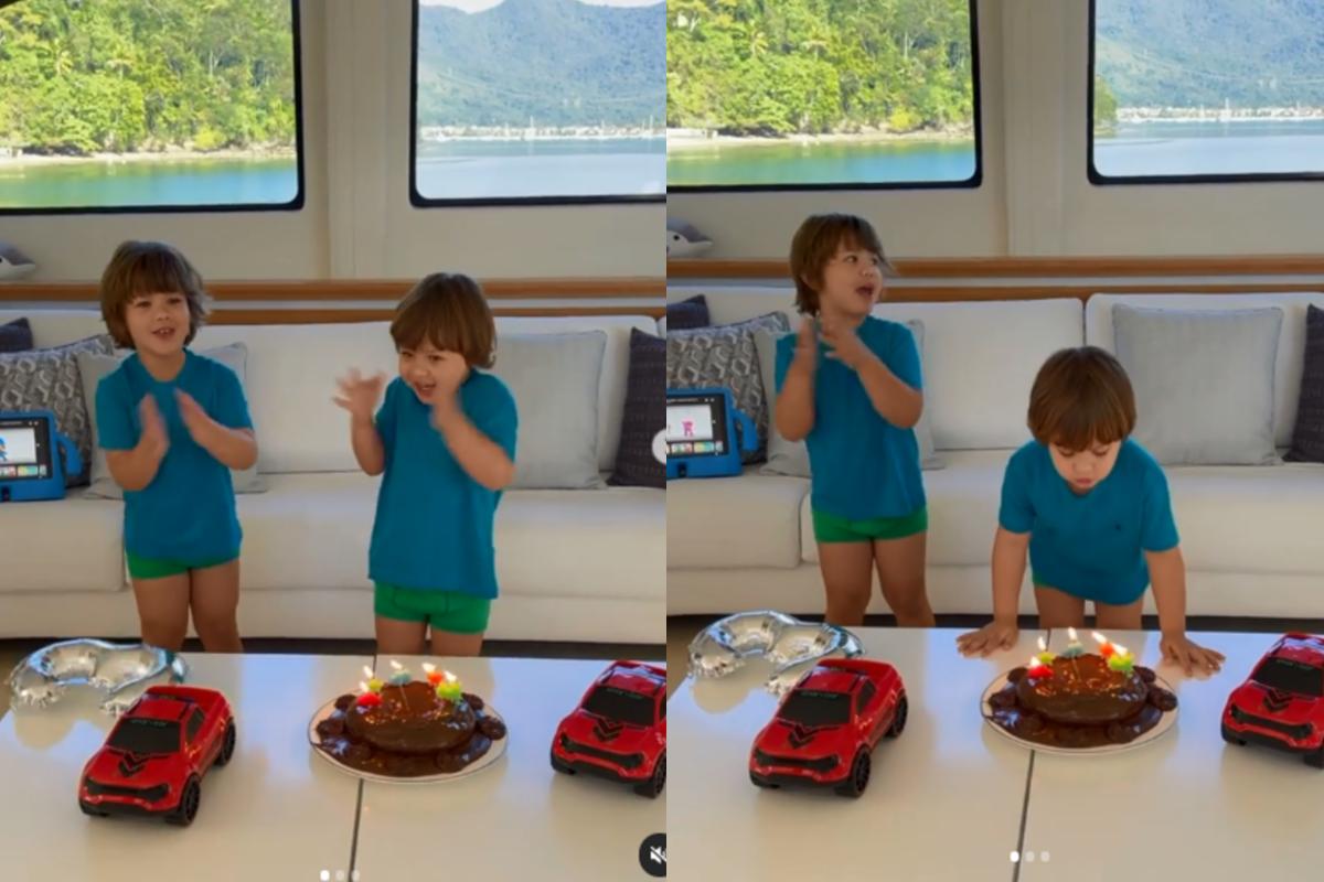 Ela usou suas redes sociais para compartilhar um vídeo da pequena celebração, feita no iate de Gusttavo Lima. No registro, o menino surge esbanjando alegria ao comemorar muito ao lado do irmão mais velho, Gabriel, de 4 anos.