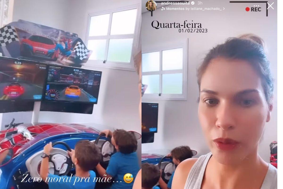 A mãe dos dois ainda contou a rotina: “Mãe, já aqui no café, ó criançada as férias acabaram, mais um pouquinho de game e depois escolinha”, disse ela. Andressa também apareceu tomando café, no momento em que fala com os filhos sobre a programação.