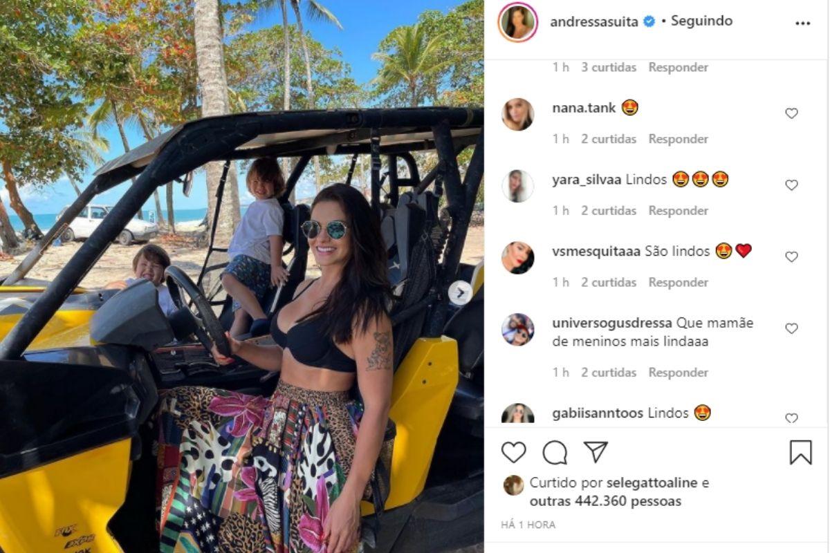 Nas imagens compartilhadas por ela, Andressa aparece ao lado dos filhos curtindo um passeio na praia em um buggy amarelo. “Curtindo as últimas horas nesse paraíso…”, contou ela, ao compartilhar a sequência de fotos.