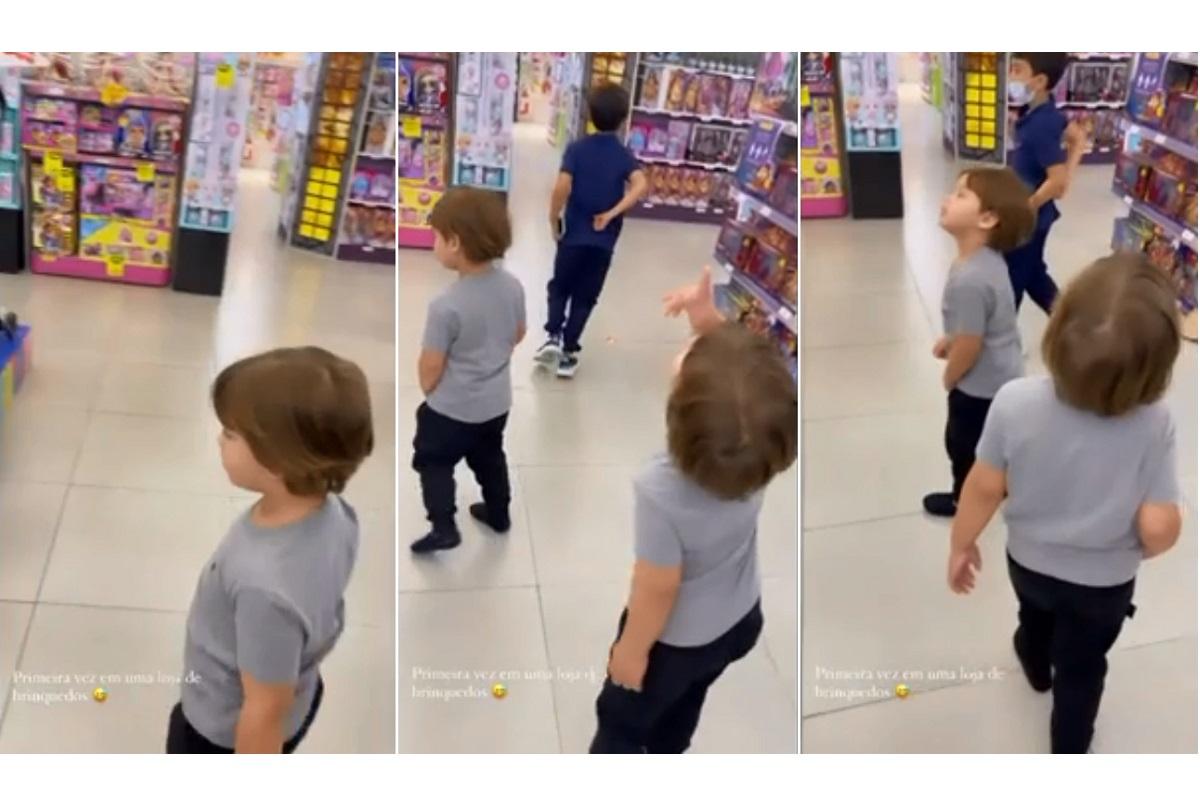 Andressa Suita levou os filhos, Gabriel, de 3 anos, e Samuel, de 2 anos, pela primeira vez a uma loja de brinquedos. A modelo registrou o momento em que os meninos chegaram ao local.