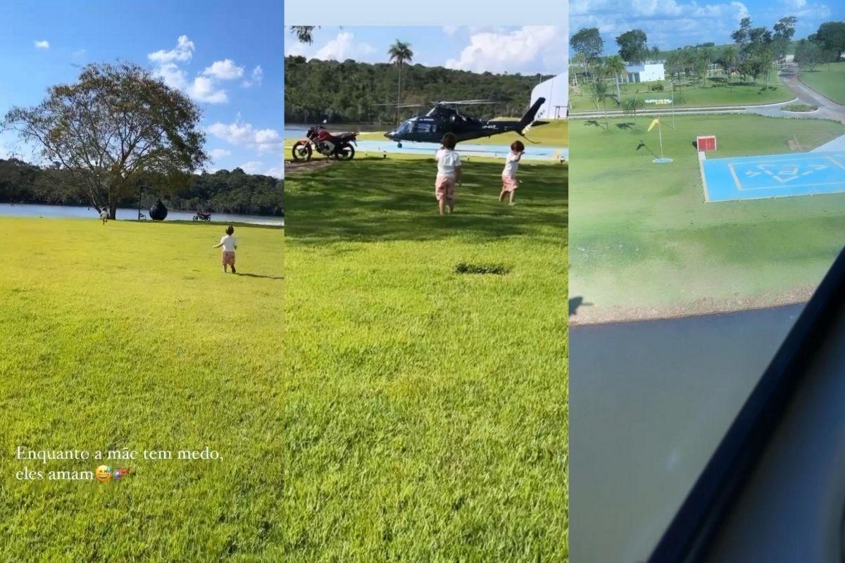 Na imagem, Gabriel e Samuel aparecem correndo pelo gramado na área externa da fazenda de Gusttavo, em direção a aeronave. “Enquanto a mãe tem medo, eles amam”, legendou ela. Na sequência ela mostra a linda paisagem durante o passeio.