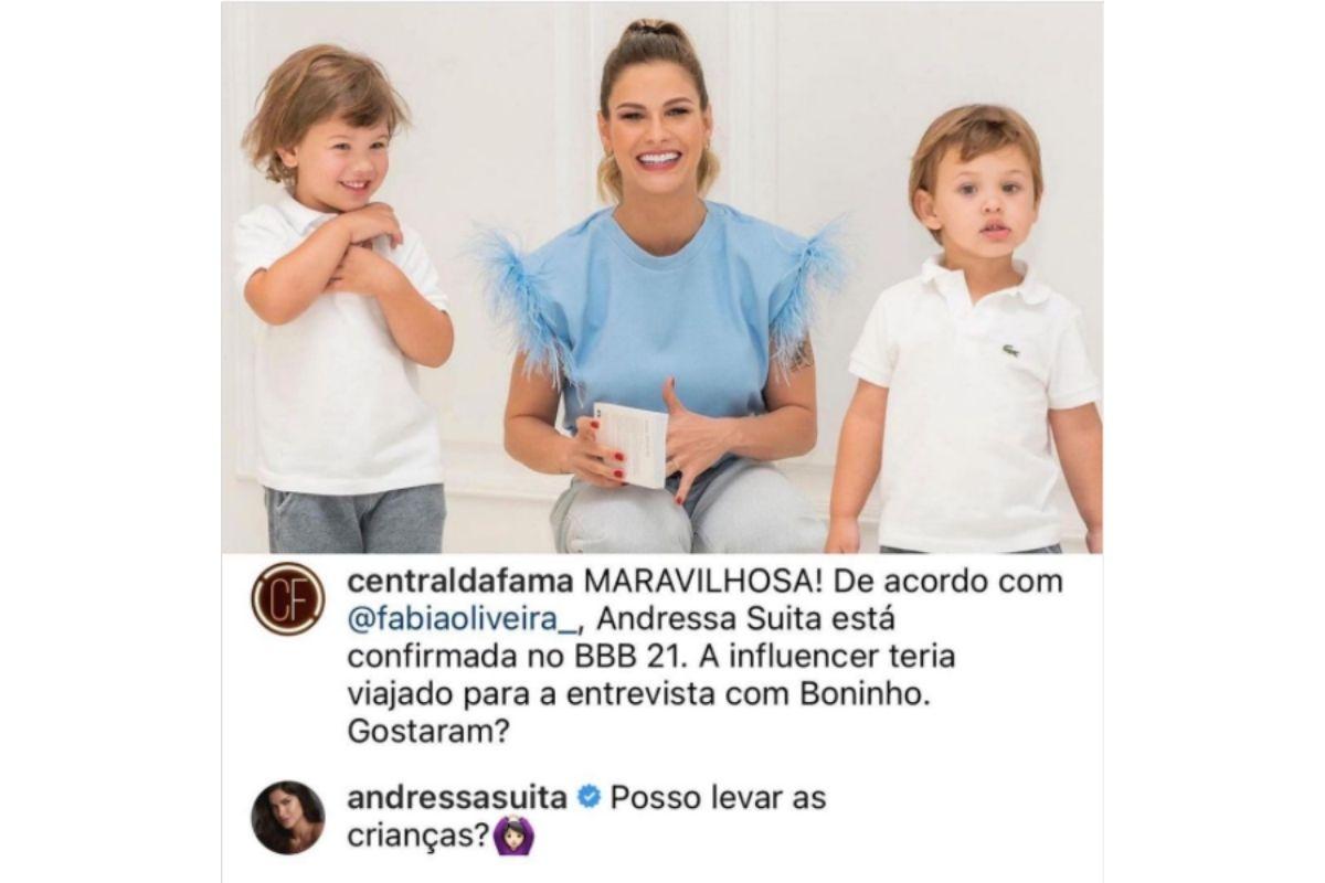 A mãe respondeu em publicação do Central da Fama que havia escrito: “MARAVILHOSA! De acordo com @fabiaoliveira_ Andressa Suita está confirmada no BBB21. A influencer teria viajado para entrevista com Boninho. Gostaram?”. Ela logo respondeu: “Posso levar as crianças?”.