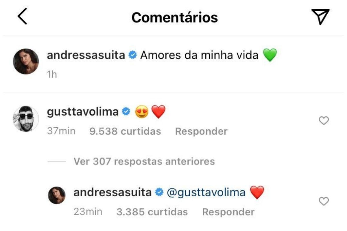 “Amores da minha vida”, legendou Andressa. Nas imagens, ela aparece brincando com os filhos durante sua festa. Em uma das fotos, a modelo come um brigadeiro oferecido pelo filho mais velho. Gusttavo aumentou os boatos de reconciliação ao comentar as fotos usando um emoji apaixonado e um coração. Andressa o respondeu também usando um coração.