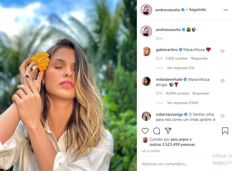 Neste sábado (24), ela compartilhou sua primeira foto desde a separação. Na imagem, a modelo apareceu sem aliança e com uma flor no cabelo. Ela recebeu os elogios de diversos famosos. A digital influencer Flávia Viana comentou: “Que mulher!”. A apresentadora Ticiane Pinheiro afirmou: “Linda”. Gabriela Pugliesi afirmou: “Maravilhosa”. Os internautas também foram só elogios para a modelo. “Você está perfeita!”, comentou uma internauta. E outra internauta afirmou: “Tão linda! Que saudades que estávamos de você”. Uma internauta também afirmou: “Maravilhosa demais!”.