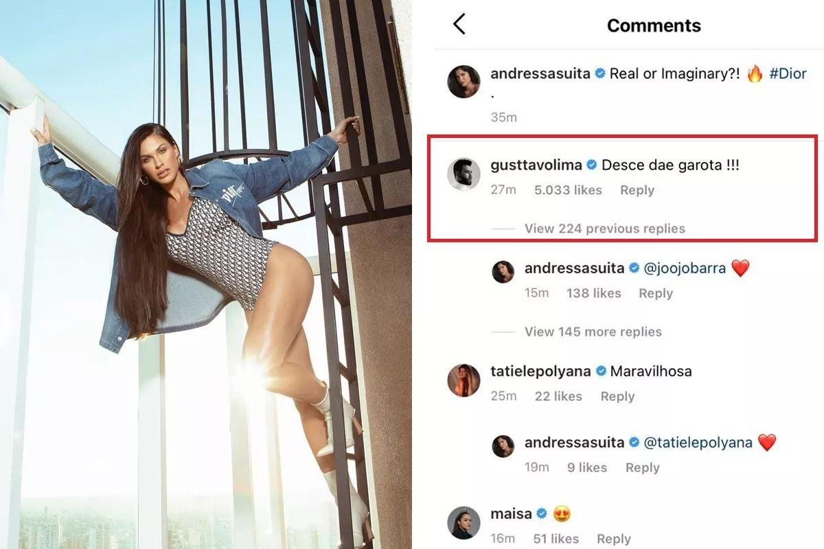 No post, Andressa Suita aparece no alto de uma escada de serviço externa em um prédio, em um ensaio de moda. Ao ver a foto, Gusttavo logo comentou: “Desce daí, garota!”.  O comentário foi o suficiente para que os internautas começassem a pedir que o artista retome o relacionamento com a modelo.