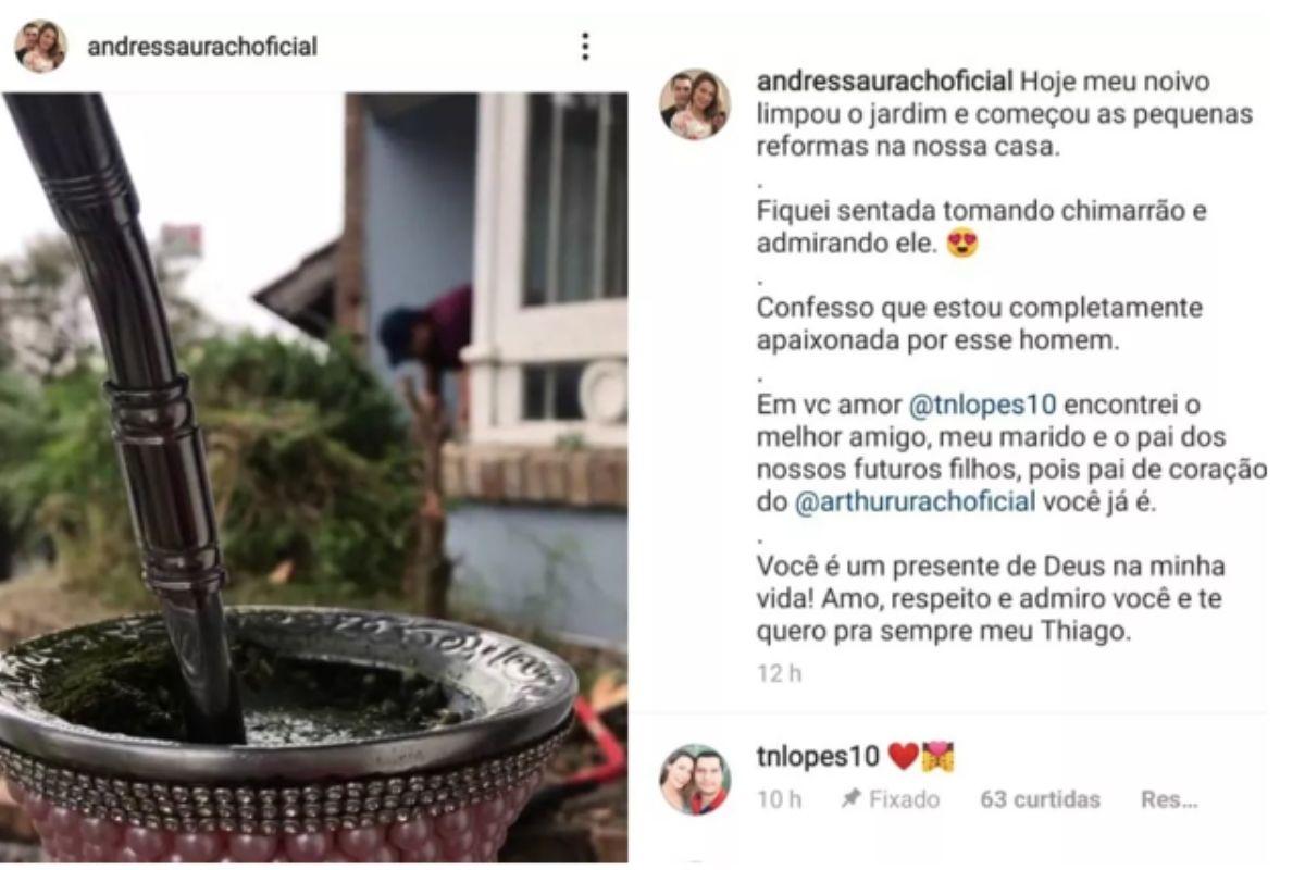 No último domingo, 6 de dezembro, Andressa Urach usou as redes sociais para se declarar ao noivo, Thiago Lopes. Ela filmou o parceiro onde eles moram juntos e não poupou elogios. Urach, é mãe de Arthur, de 15 anos, deixou claro que o garoto e o noivo se dão bem.