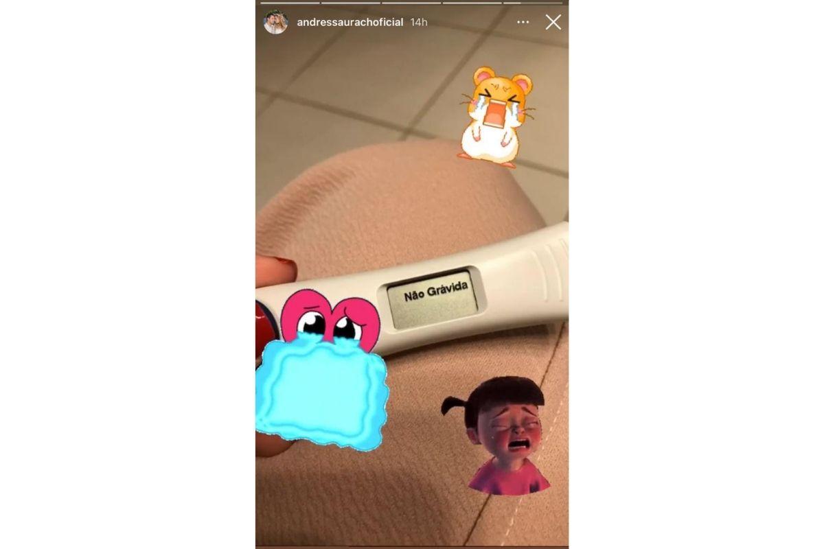 Andressa Urach contou em uma entrevista ao jornalista Leo Dias que ela e Thiago já estão tentando engravidar, e que em breve ela traria novidades. A ex-Fazenda cumpriu o que prometeu, mas não foi o esperado: através dos stories do Instagram, ela mostrou o teste de gravidez após as tentativas, mas o resultado era negativo e apontava que ela não havia conseguido engravidar.