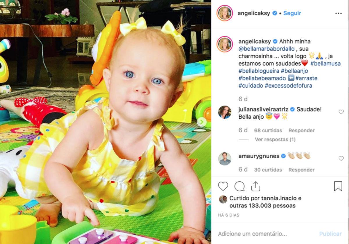 Bella, filha da sobrinha de Angélica, Nathy Marbá, está viajando com a família e a tia-avó não deixou de registrar a saudade no Instagram. “Ah, minha Bella… Volta logo, estamos com saudade”, escreveu a apresentadora.