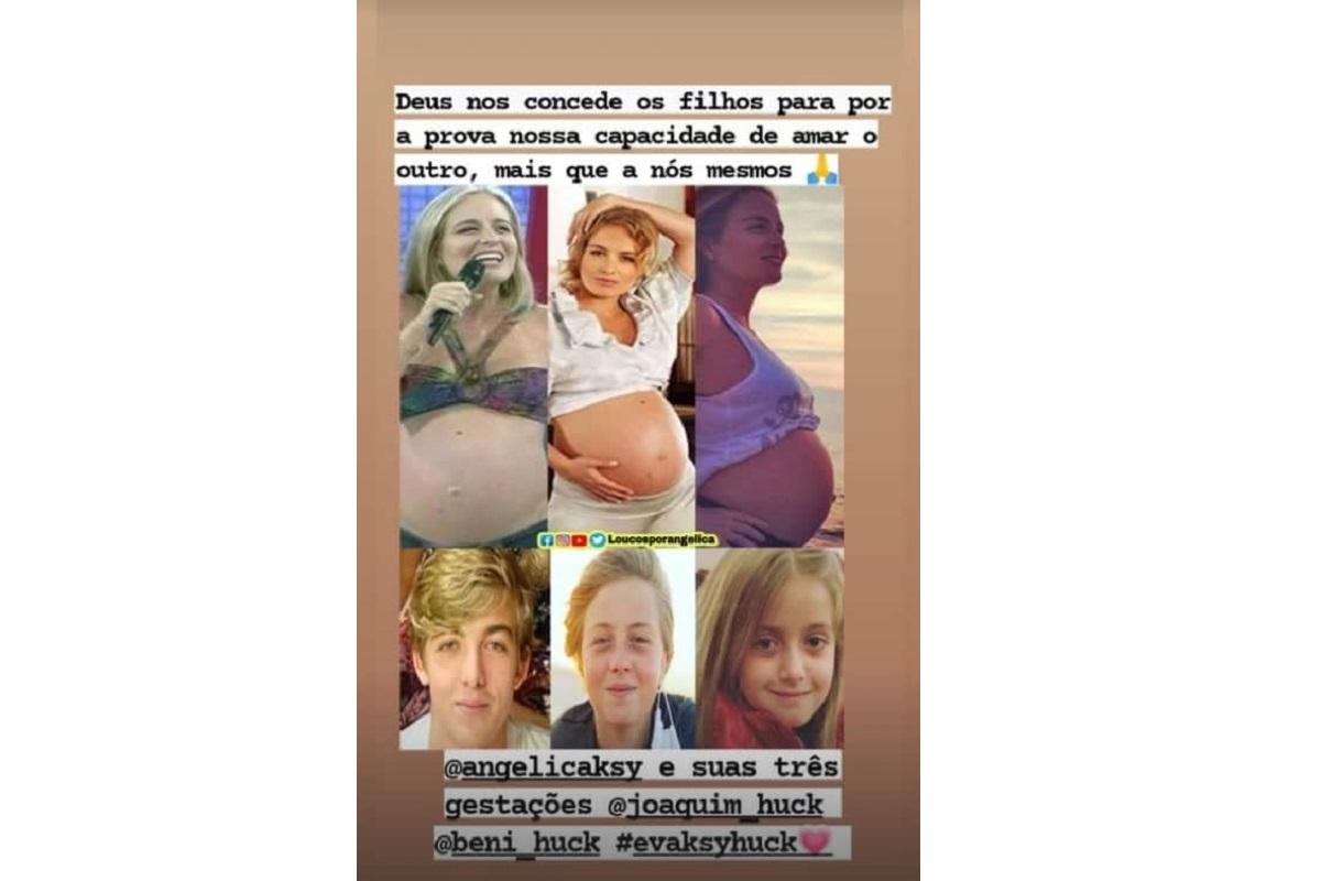 Angélica decidiu relembrar três momentos especiais em sua vida. Ela se recordou de quando estava esperando cada um de seus três filhos: Joaquim, de 15 anos, Benício, de 13 anos, e Eva, de 8 anos — frutos do relacionamento da apresentadora com Luciano Huck
