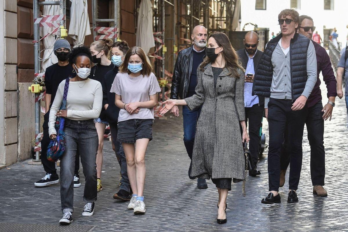 Angelina Jolie foi vista em Roma passeando com 5 dos 6 filhos que tem com Brad Pitt. Na foto ela está usando um sobretudo cinza e salto alto, elegante como sempre. Estavam acompanhando ela estavam Maddox, 20, Zahara, 16, Shiloh, 15, os gêmeos Vivienne e Knox, de 13, que recentemente também estiveram com a mãe no red carpet de uma premiere em Los Angeles.