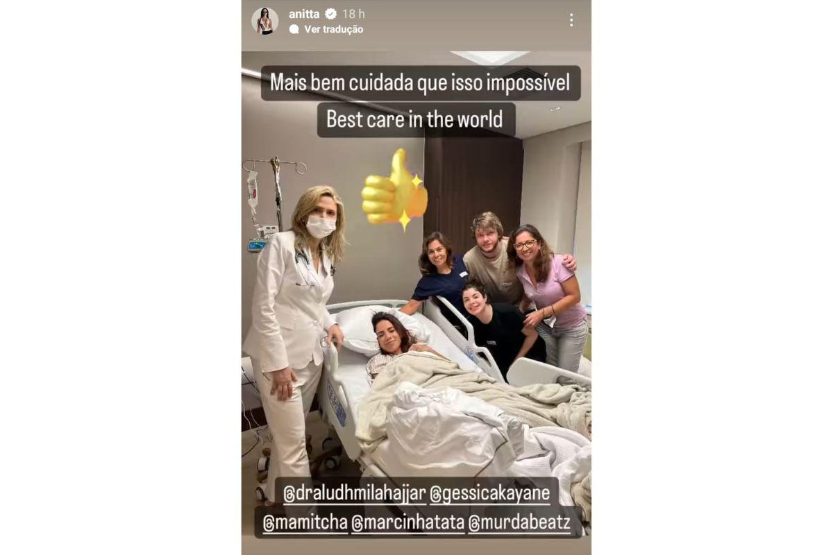 Já na rede social Instagram, Anitta publicou um storie dizendo que está bem acompanhada. Além da equipe médica, a artista está ao lado da amiga, a Gkay, e do namorado, o Murda Beatz.