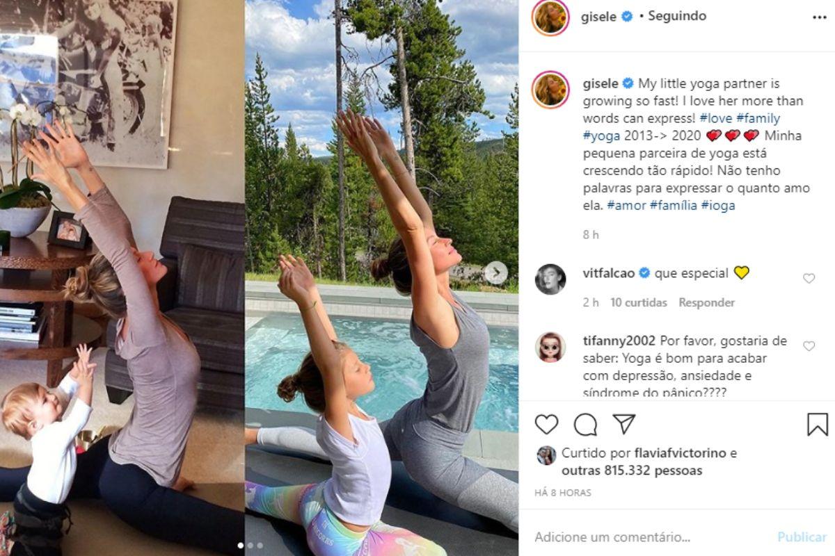 A modelo Gisele Bündchen usou as redes sociais para compartilhar o antes e depois da filha, Vivian Lake Brady, 7 anos, fruto do relacionamento com o jogador Tom Brady. Nas imagens, as duas aparecem fazendo yoga juntas. Na primeira foto, tirada em 2013, a garota ainda é uma bebê, já na segunda, Vivian está bem maior, acompanhando a mãe no esporte. “Minha pequena parceira de ioga está crescendo tão rápido! Não tenho palavras para expressar o quanto amo ela.”, escreveu a famosa junto às imagens.