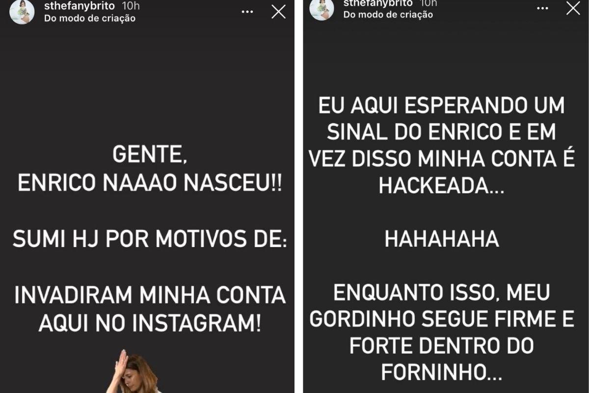 Sthefany Brito teve a conta do Instagram invadida e estava tentando recuperar o acesso. “Gente, Enrico não nasceu. Sumi hoje por motivos de: invadiram a minha conta aqui no Instagram. Passei o dia nessa função e agora a noite consegui ter acesso de novo”, começou.