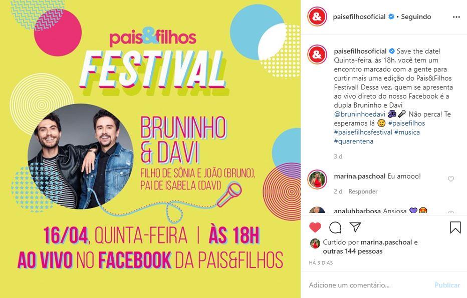 Pais&Filhos Festival chegou para levar diversão para dentro da sua casa durante o isolamento social que estamos vivendo. Como nossa bandeira diz: “Juntos É Possível”. Então, unimos forças para tornar essa fase de luta contra o coronavírus mais leve. A dupla Bruninho&Davi está ao vivo no nosso Facebook. Você consegue assistir à transmissão completa no vídeo abaixo: