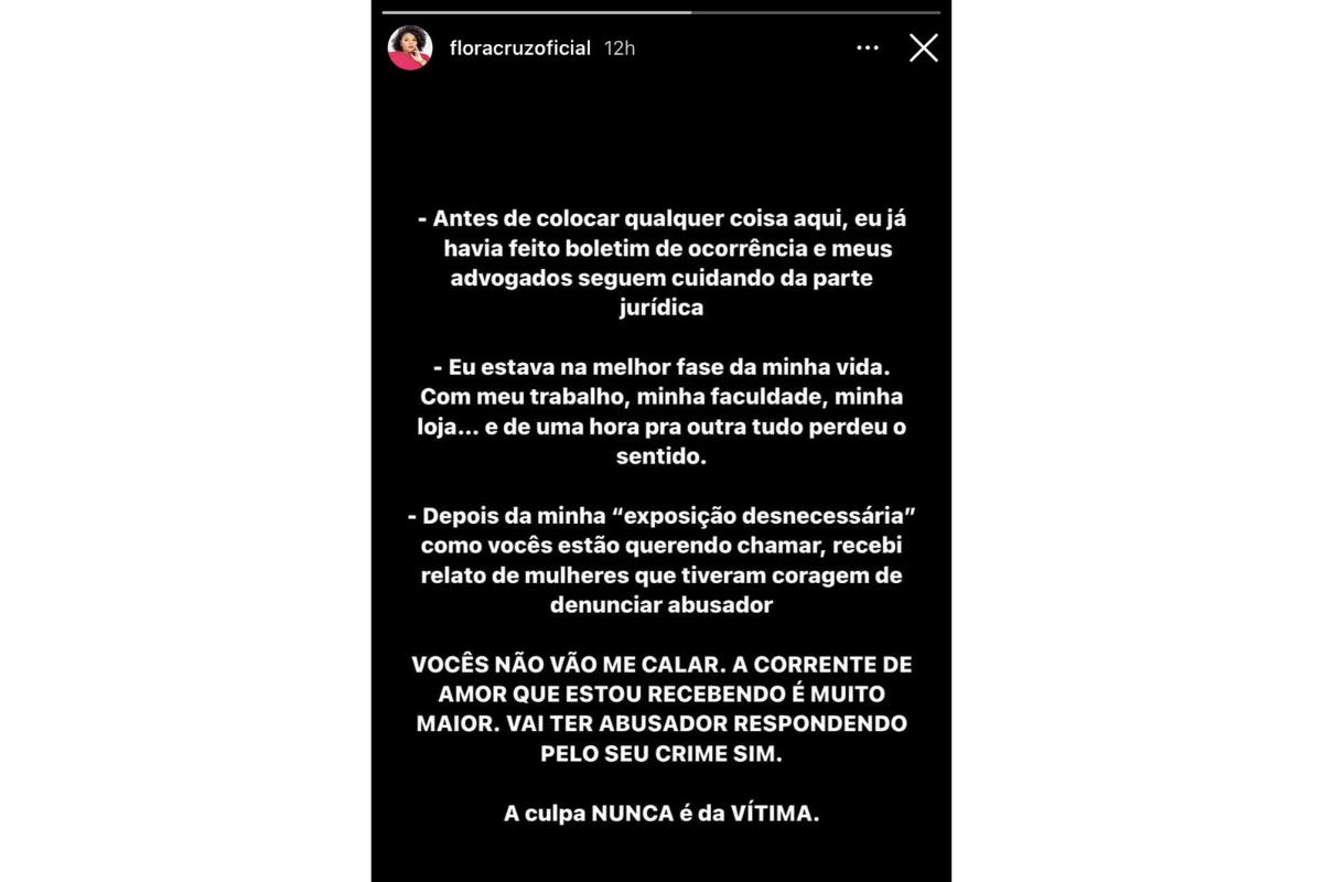 Ao final de seu desabafo, Flora Cruz reforçou que o abusador será responsabilizado por seus atos, e que a culpa nunca deve ser atribuída à vítima.