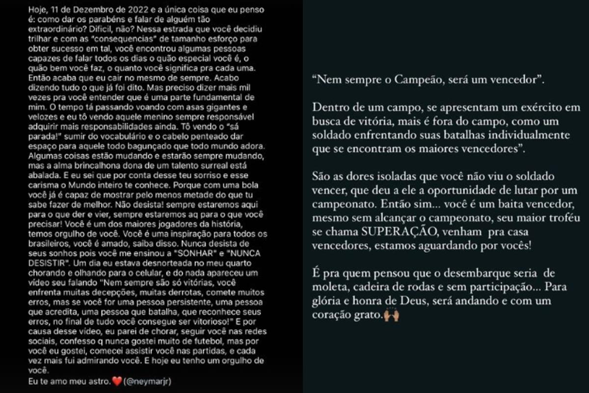 Um dia eu estava desnorteada no meu quarto chorando e olhando para o celular e, do nada, apareceu um vídeo seu falando: ‘Nem sempre são só vitórias, você enfrenta muitas decepções, muitas derrotas, comete muitos erros, mas se você for uma pessoa persistente, uma pessoa que acredita, uma pessoa que batalha, que reconhece seus erros, no final de tudo você consegue ser vitorioso!’. E, por causa desse vídeo, eu parei de chorar, segui você nas redes sociais. Confesso que nunca gostei muito de futebol, mas por você eu gostei, comecei a assistir você nas partidas e cada vez mais fui admirando você. E hoje eu tenho orgulho de você. Eu te amo, meu astro.