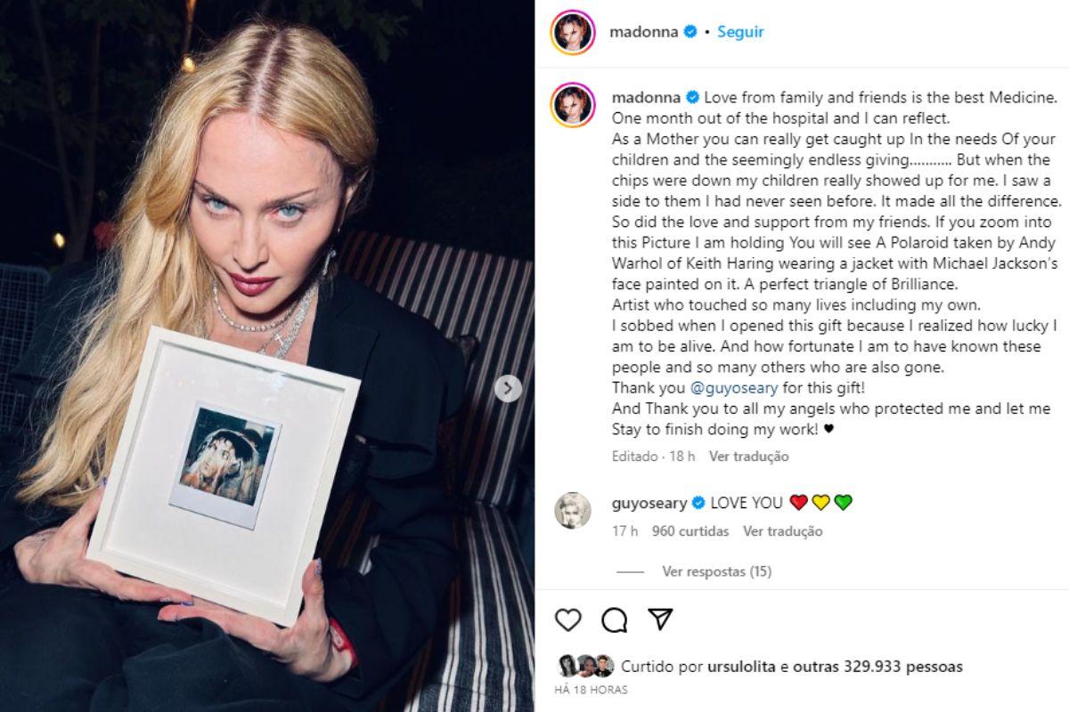 Madonna, aos 64 anos, utilizou sua conta no Instagram neste último domingo, 30 de julho, para publicar um texto revelador sobre como seus familiares e amigos foram fundamentais em sua jornada de recuperação. A cantora destacou que o “amor da família e amigos é o melhor remédio” e que, durante o último mês, desde sua alta hospitalar, teve a oportunidade de refletir sobre diversos aspectos de sua vida.