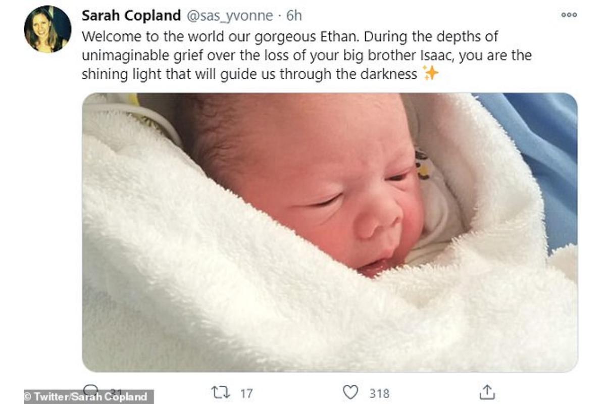 Ao contar a novidade da chegada do bebê no Twitter, ela escreveu: “Bem-vindo ao mundo nosso lindo Ethan. Durante o profundo processo de um luto inimaginável depois da perda do seu irmão mais velho Isaac, você é a luz brilhante que vai nos guiar pela escuridão”.