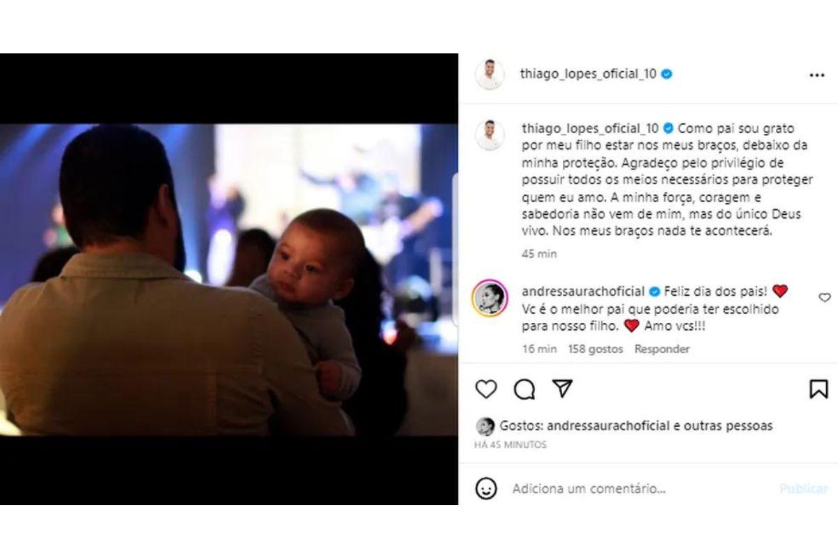 Thiago disse ser grato por poder proteger o filho de um ano e seis meses: “Como pai, sou grato por meu filho estar nos meus braços, debaixo da minha proteção. Agradeço pelo privilégio de possuir todos os meios necessários para proteger quem eu amo. A minha força, coragem e sabedoria não vem de mim, mas do único Deus vivo. Nos meus braços nada te acontecerá”. Andressa perdeu na Justiça a guarda do filho em julho deste ano. Ela já havia se afastado do menino por causa de um surto bipolar no ano passado.