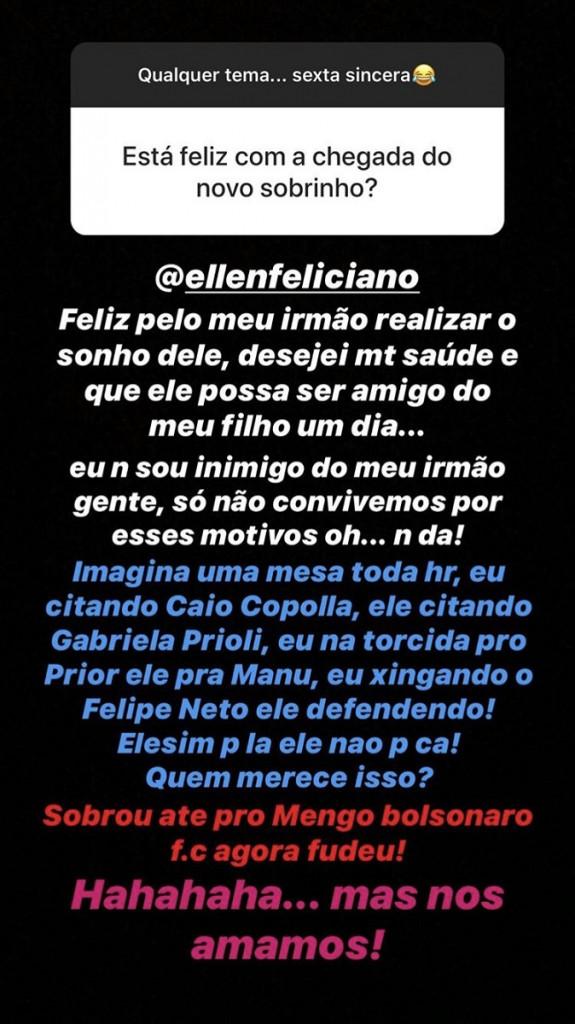 Ele ainda explicou porque não mantém contato com o irmão: “Eu não sou inimigo do meu irmão, gente, só não convivemos por esses motivos… Oh, não dá! Imagina uma mesa toda hora, eu citando Caio Copolla, ele citando Gabriela Prioli. Eu na torcida pro Prior, ele pra Manu. Eu xingando o Felipe Neto, ele defendendo. Ele sim pra cá, ele não pra lá. Quem merece isso?”. No final, ressaltou que ama o irmão: “Mas nos amamos”.