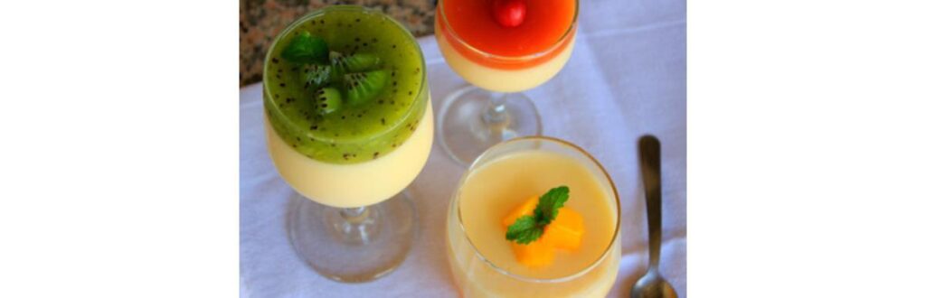 Descasque as frutas e bata uma de cada vez no liquidificador. Intercale as camadas dos cremes em potinhos transparentes. Você pode colocar em taças e enfeitar com pedaços das frutas e folhas de hortelã para dar um charme.