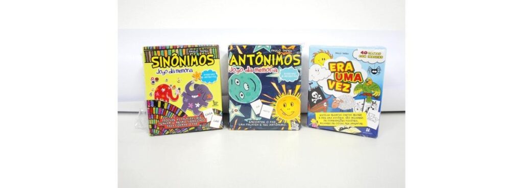 Esses são os jogos de carta “Antônimos – Jogo da Memória” (50 cartas), “Sinônimos – Jogo da Memória” (50 cartas) e “Era Uma Vez” (40 cartas), todos de autoria do escritor Paulo Tadeu.