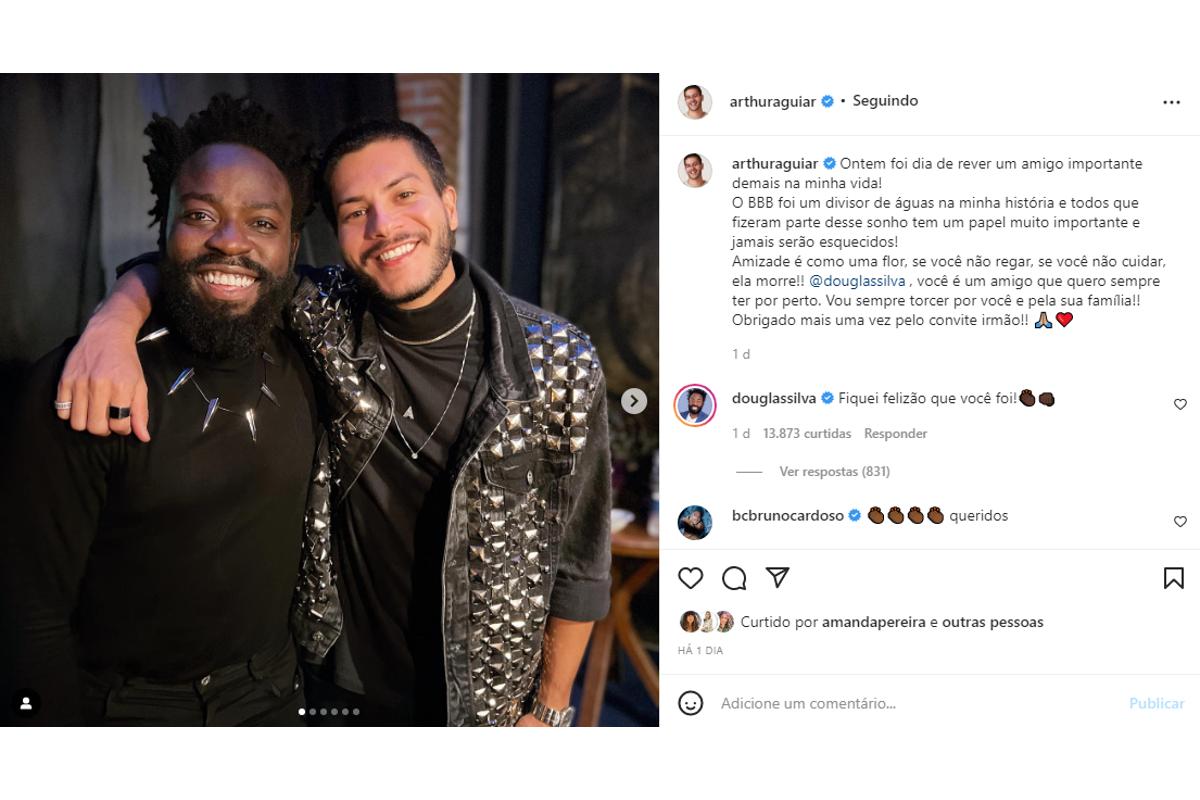 Na noite deste domingo, 5 de junho, Arthur agradeceu DG pelo convite e publicou uma foto ao lado do amigo em seu perfil no Instagram. “Ontem foi dia de rever um amigo importante demais na minha vida! O BBB foi um divisor de águas na minha história e todos que fizeram parte desse sonho tem um papel muito importante e jamais serão esquecidos! Amizade é como uma flor, se você não regar, se você não cuidar, ela morre!! @douglassilva, você é um amigo que quero sempre ter por perto. Vou sempre torcer por você e pela sua família!! Obrigado mais uma vez pelo convite irmão!!”, escreveu Arthur.