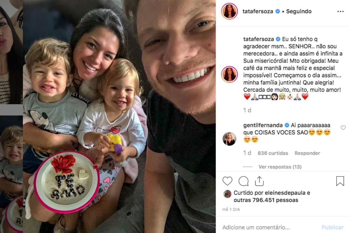 “Eu só tenho que agradecer mesmo… Senhor… Não sou merecedora… E ainda assim é infinita a Sua misericórdia! Muito obrigada! Meu café da manhã mais feliz e especial impossível! Começamos o dia assim… Minha família juntinha! Que alegria! Cercada de muito, muito amor”, escreveu na legenda.