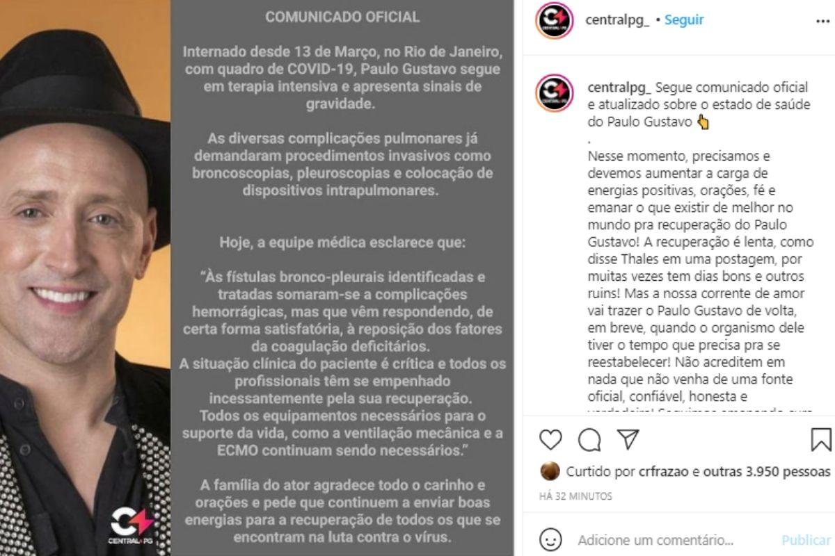 Paulo Gustavo está internado desde o dia 13 de março com Covid-19. A assessoria do ator publicou uma nova nota noite desta domingo, 11 de abril, sobre a atualização do estado de saúde do humorista, que está realizando o tratamento ECMO.