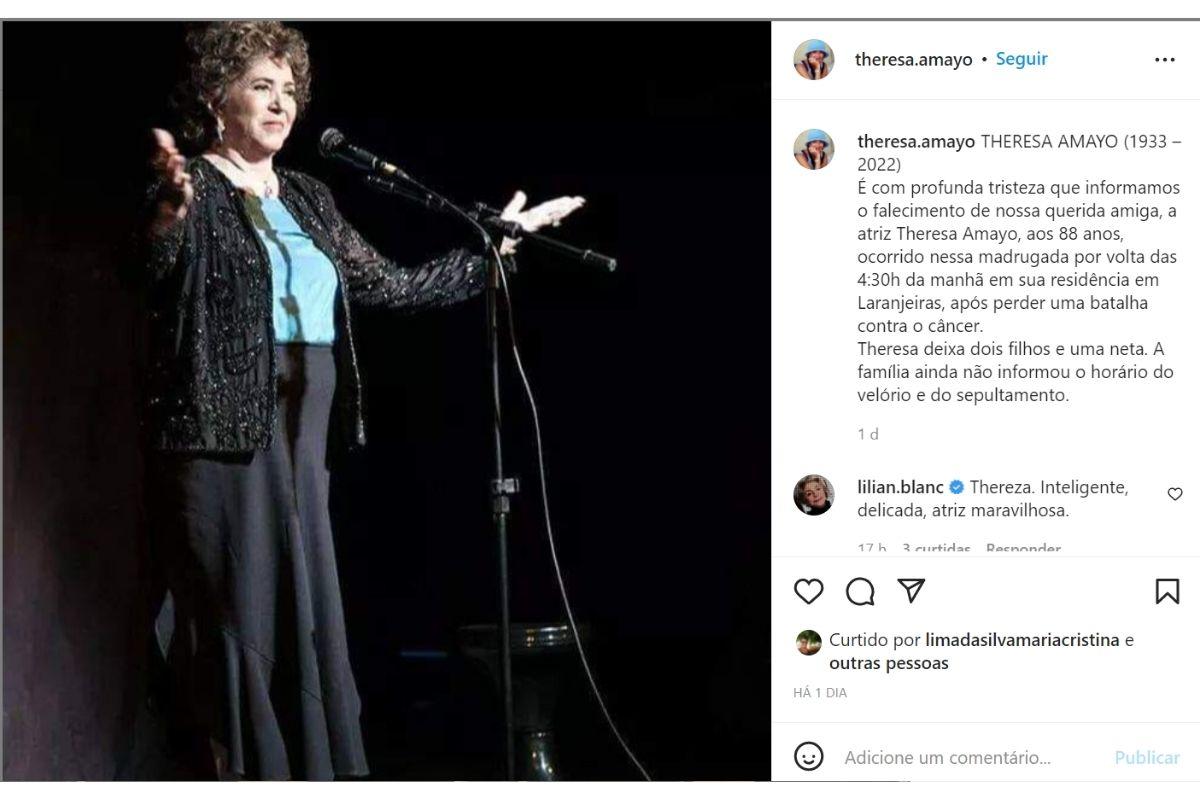 “THERESA AMAYO (1933 – 2022). É com profunda tristeza que informamos o falecimento de nossa querida amiga, a atriz Theresa Amayo, aos 88 anos, ocorrido nessa madrugada por volta das 4:30h da manhã em sua residência em Laranjeiras, após perder uma batalha contra o câncer. Theresa deixa dois filhos e uma neta. A família ainda não informou o horário do velório e do sepultamento”.
