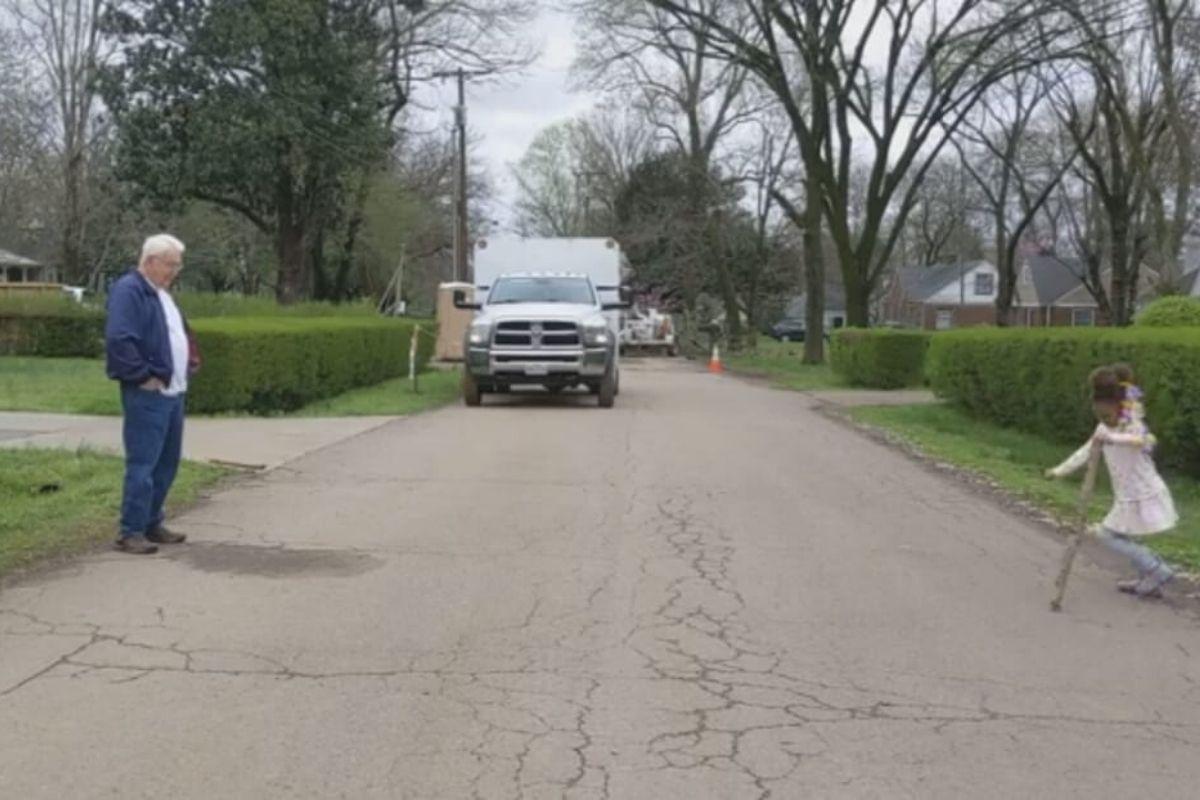 A cena foi gravada por Sherrie Neely, mãe da criança e filha do idoso. Ela e a família moram na mesma rua, uma casa da frente para a outra e eles continuam se vendo, mesmo que de longe, durante o surto do novo coronavírus. O avô, de 80 anos, saiu de casa para cumprimentar a neta Kira, de 5 anos, e os dois aproveitaram o momento para dançar ao som da música ABC, do Jackson 5.