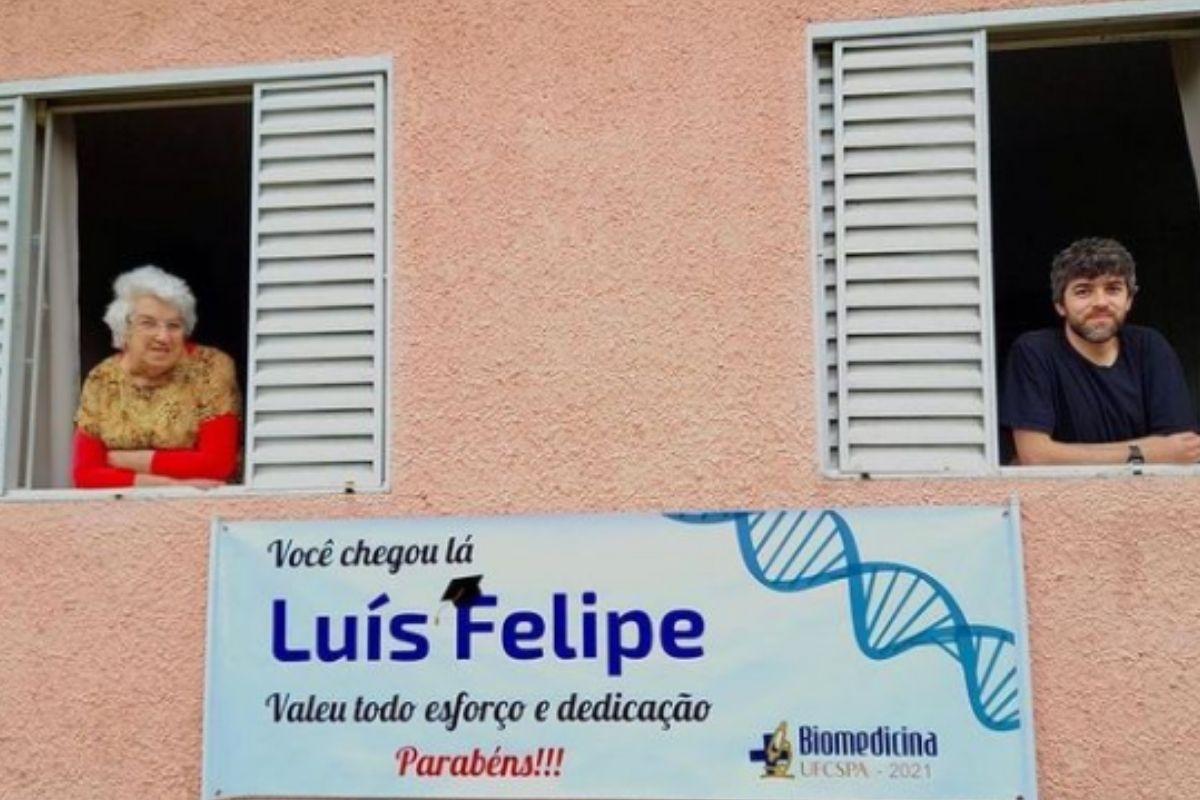 Uma avó estendeu uma grande faixa em forma de homenagem ao primeiro neto da família a se formar em uma universidade. Luís Felipe, de 28 anos, se formou em biomedicina na Universidade Federal de Ciências da Saúde, em Porto Alegre (RS).