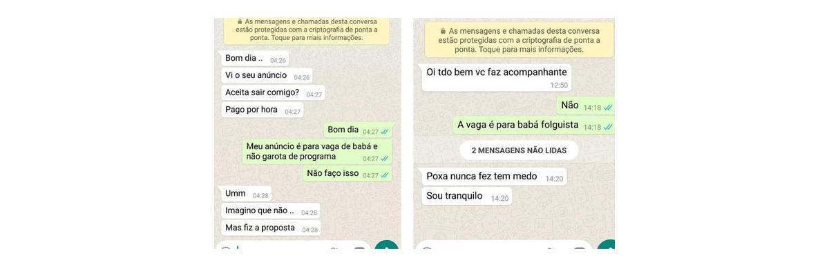A moça ficou muito envergonhada.”Eu me recusava a acreditar que aquilo era verdade, afinal, não havia nenhuma mensagem subliminar no meu anúncio. Quando mais homens começaram a me procurar, eu percebi que era sério. Fiquei com muito nojo. Eles acham que por eu estar precisando de trabalho, aceitaria qualquer coisa”, contou durante a entrevista.