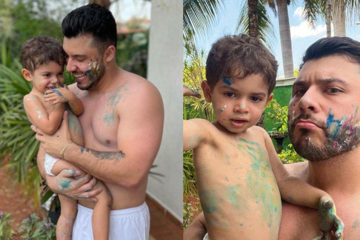 Pai coruja, o sertanejo aproveitou para fazer uns cliques com o menino e as publicações do momento foram parar em seu perfil na plataforma Instagram. Em uma série de imagens onde aparece carregando Leo em seu colo, pai e filho estão sujos de tinta com as expressões mais felizes possíveis.