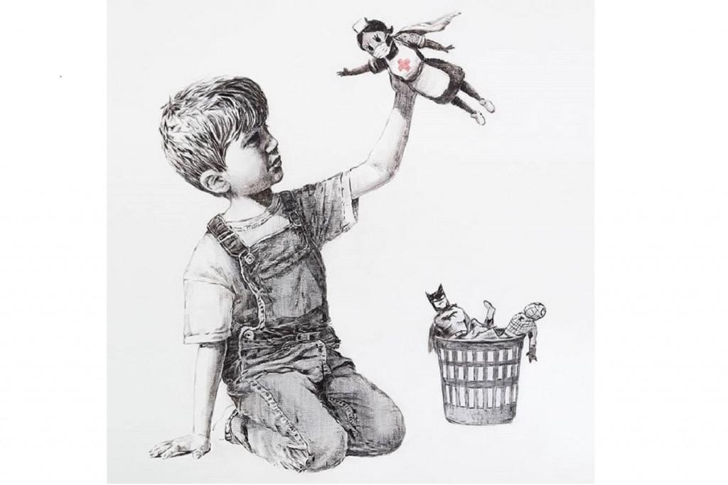 Uma nova obra de Banksy mostra a gratidão britânica pelos profissionais do Serviço Nacional de Saúde (NHS) durante a crise do coronavírus. O desenho mostra um menino que escolheu o boneco de uma enfermeira como super-heroína, e não o boneco do Batman ou do Homem-Aranha.