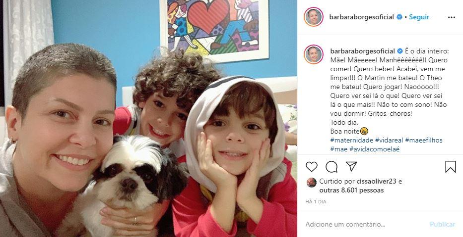 Bárbara Borges pegou os seguidores do Instagram de surpresa recentemente publicando uma foto com a cabeça raspada ao lado dos filhos Martin e Theo, fruto do relacionamento de anos com Pedro Delfino. Em entrevista para Patrícia Kogut, colunista do jornal O Globo, a artista disse que dessa vez a mudança visual não teve relação com nenhuma personagem nova e, sim, pessoal.