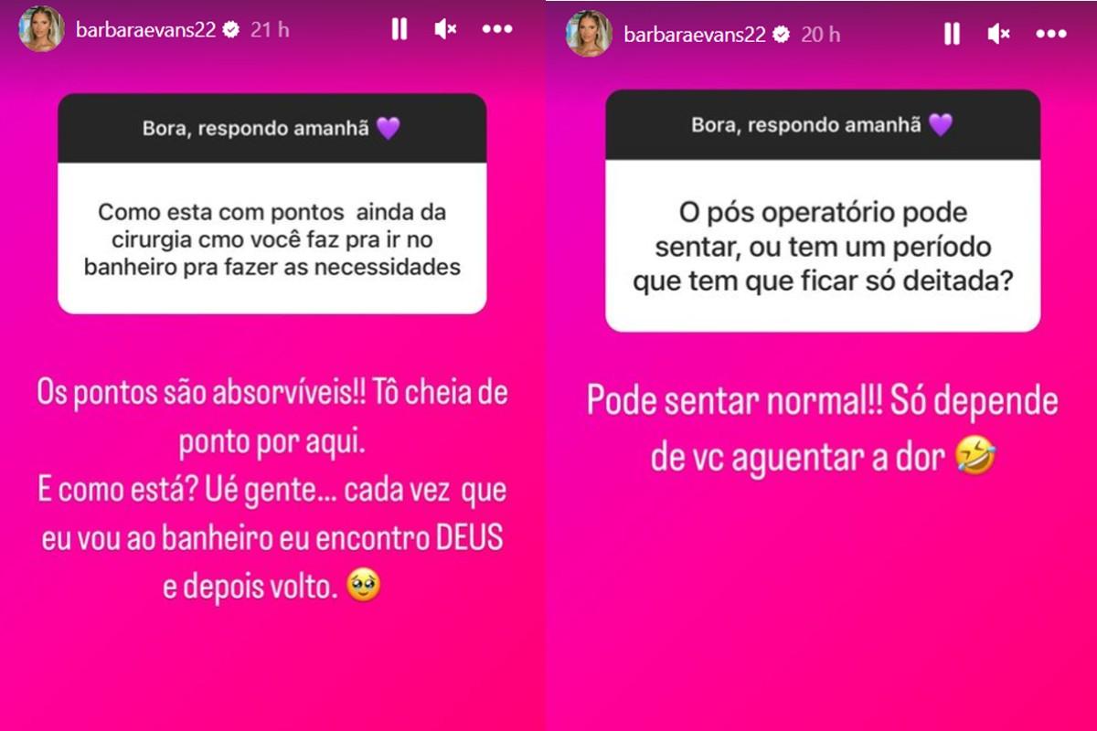 As respostas vieram no sábado. Questionada sobre como estava a dor e como fazia para ir ao banheiro, Bárbara foi bem sincera: “Cada vez que eu vou ao banheiro eu encontro Deus e depois volto”, escreveu.
