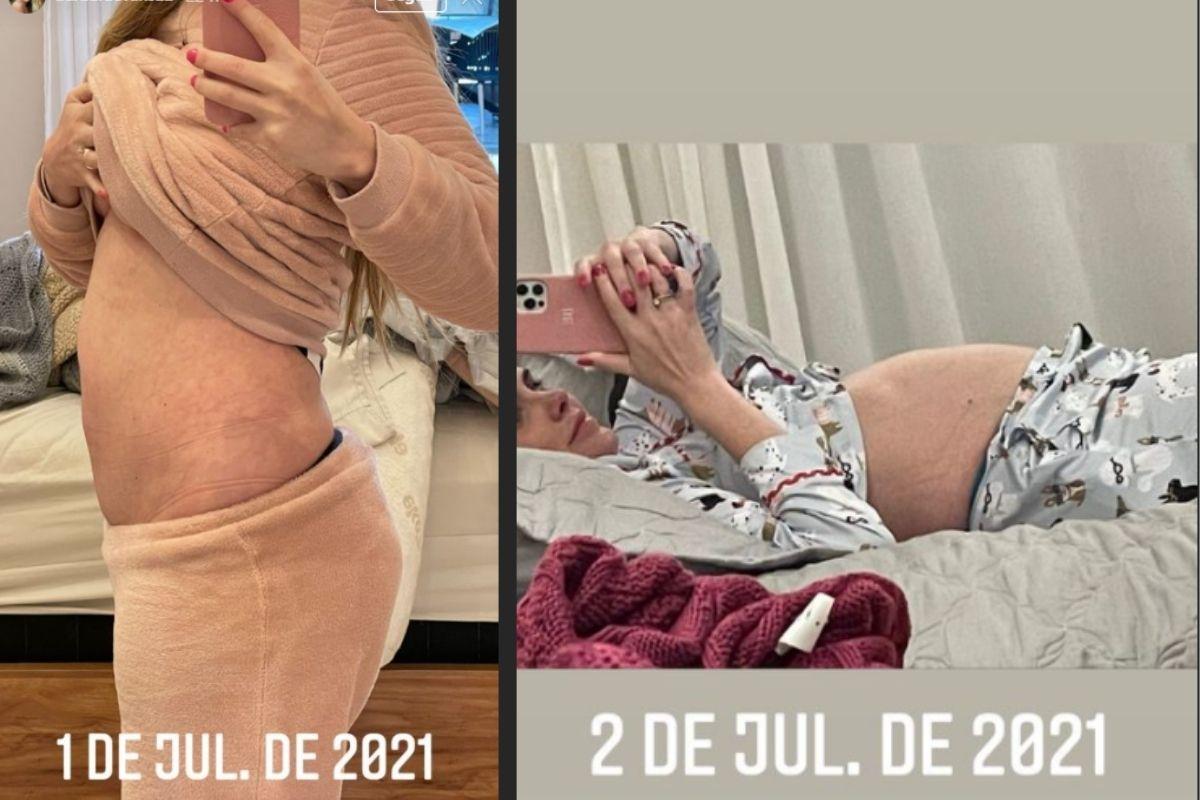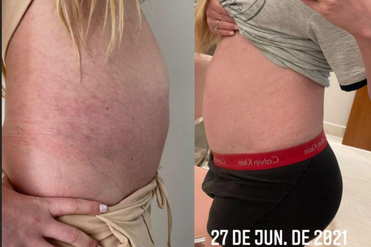 A jovem usou os Stories para mostrar a evolução do corpo em um intervalo de poucos dias. “Mais fotos da barriguinha durante o tratamento”, escreveu a influenciadora. A primeira foto é do dia 27 de junho e mostra o abdômen da modelo bem inchado com as veias aparecendo.