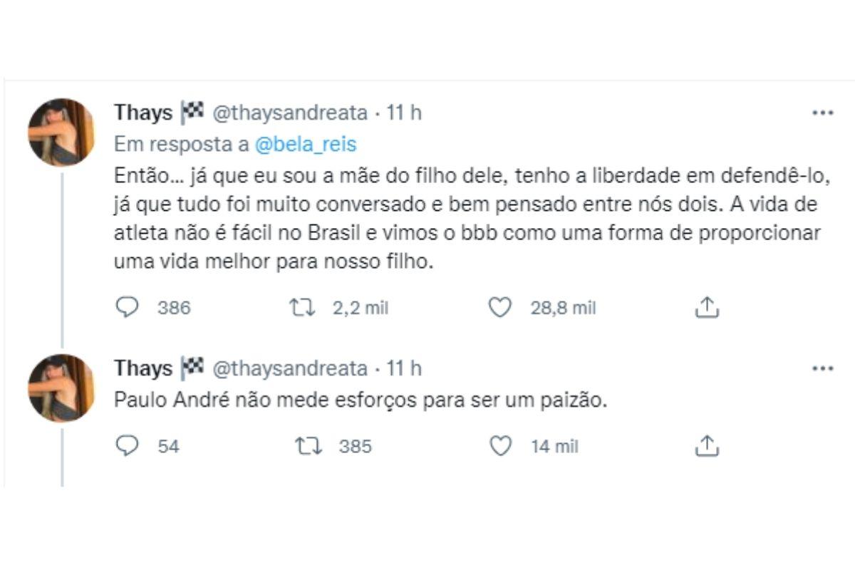 “Paulo André não mede esforços para ser um paizão”. Os tweets de Thays em resposta a internauta já acumula mais de 20 mil curtidas na rede social.