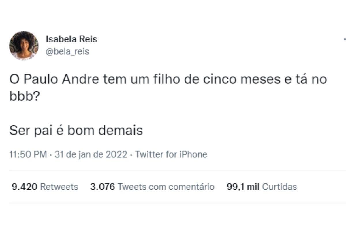 Uma espectadora viralizou no Twitter ao escrever: “O Paulo André tem um filho de cinco meses e tá no BBB? Ser pai é bom demais”.
