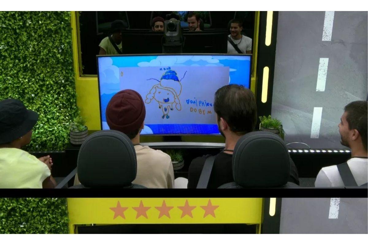 Os desenhos foram fotografados e, na gravação, que explica cada um deles é Cintia Dicker. Diante da situação, Scooby sorri e se emociona: “Ah, meus amores!”, e começa a aplaudir. Os outros brothers que o acompanhavam no almoço – Paulo André, Gustavo e Arthur Aguiar – também se emocionaram com a cena.