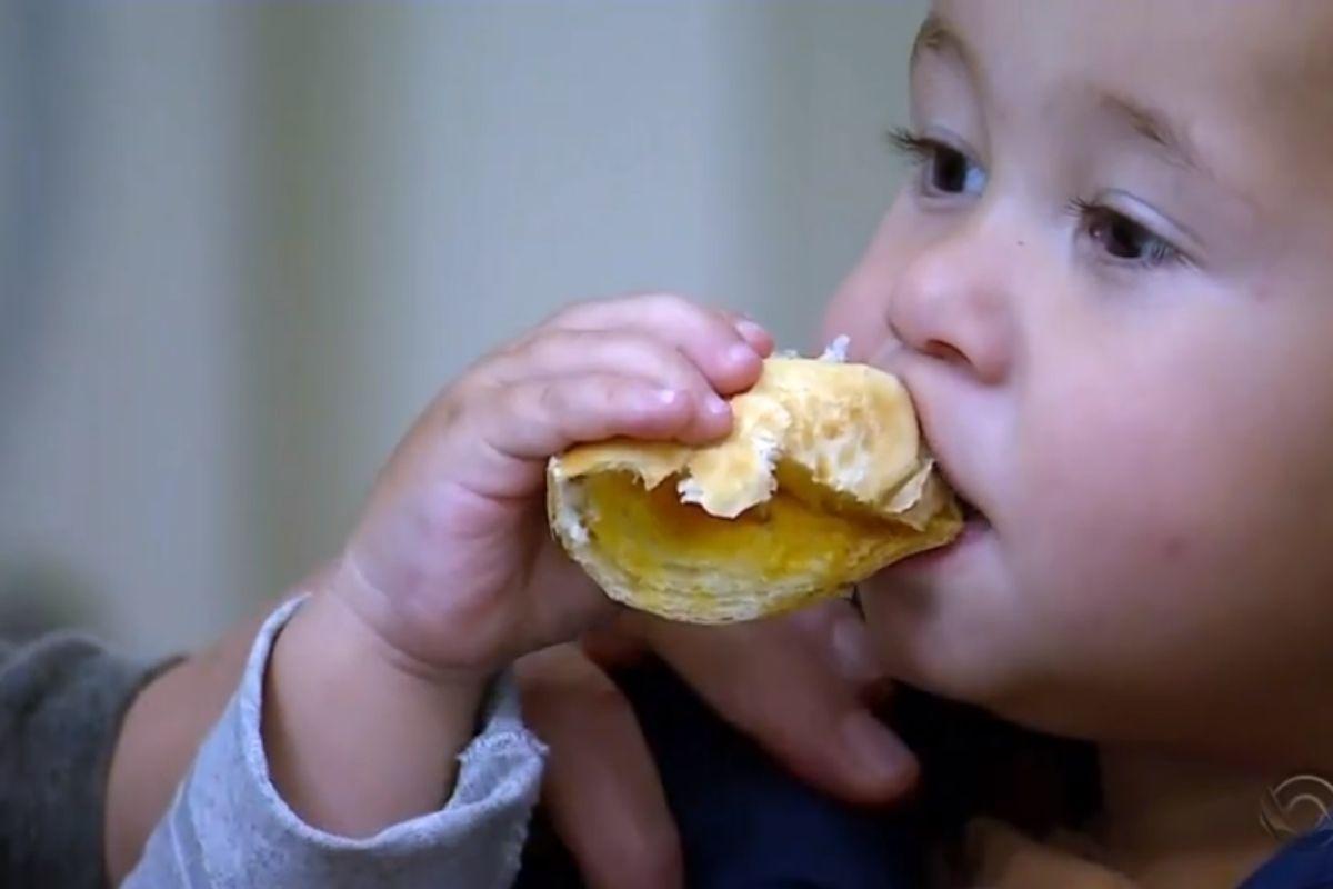Ao mesmo tempo que agradecia com a mãozinha no rosto disfarçando, a outra pegava a comida do prato. “Surpreendeu bastante. Ele é bem sapequinha. Ele come de tudo. É bom de garfo”, contou a mãe Pâmela Rech ao G1.